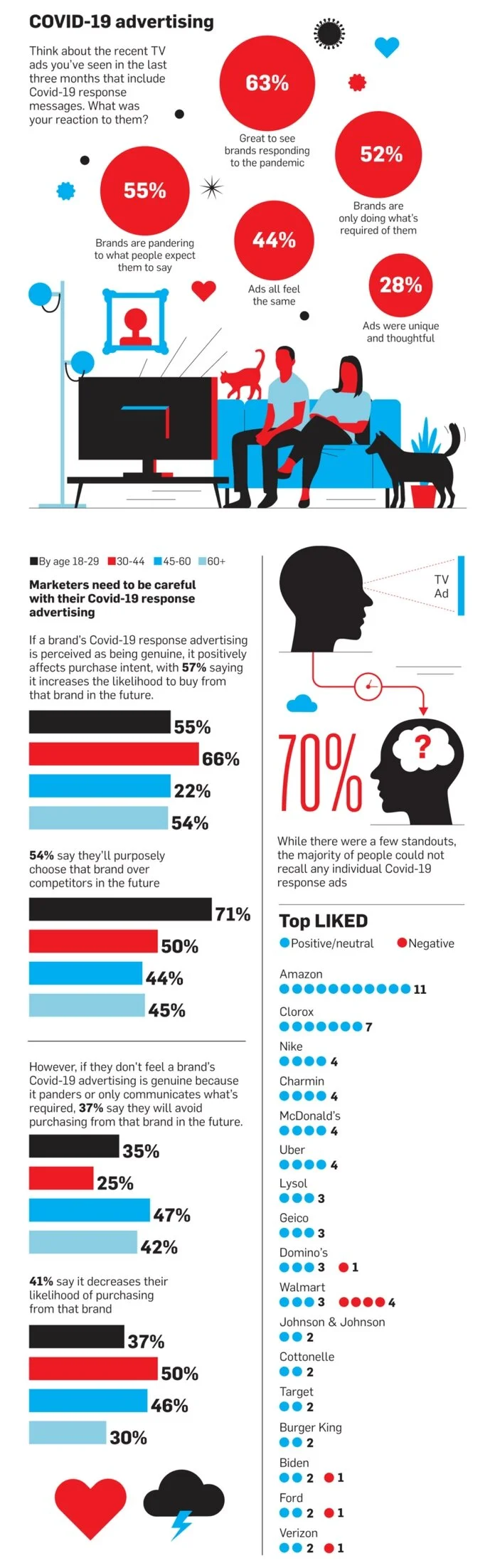 Real Talk Insights conducted a study looking at how people are responding to ads that include Covid-19-related messaging. More than 60% felt it was still great to see this type of response from brands, while more than half (55%) felt brands were pandering and 44% felt that all the ads blurred together and looked the same. And while many are largely indifferent about these types of ads, almost three-quarters (70%) couldn’t recall any brand’s specific response to Covid-19.